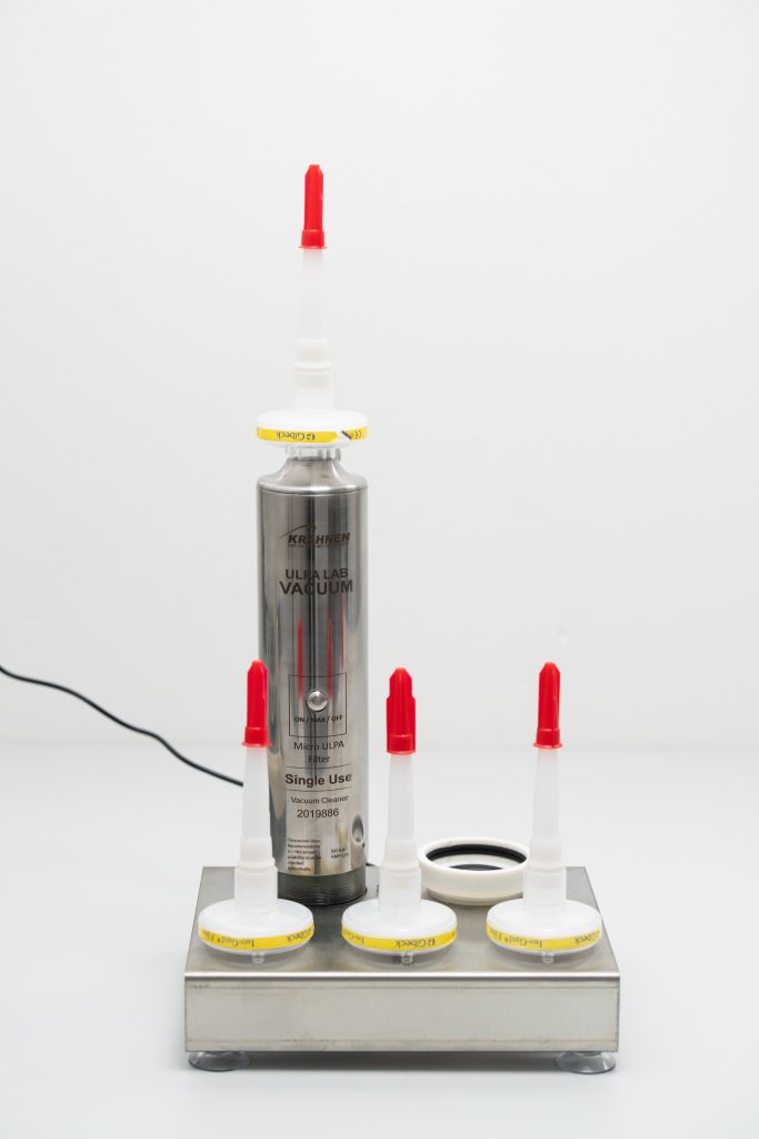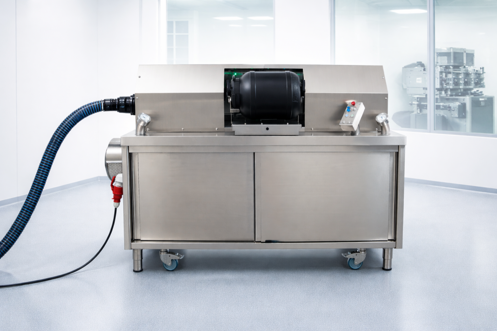 Ausgestattet mit einem 2.200-Watt-Seitenkanalverdichter, Zyklonabscheider sowie einem Mehrfachfiltersystem aus M-, HEPA H14- und Aktivkohlefiltern, gewährleistet das vollständig aus Edelstahl gefertigte System eine sichere und effiziente Staubabsaugung. Der 50-Liter-Auffangbehälter ermöglicht eine einfache und sichere Entsorgung.