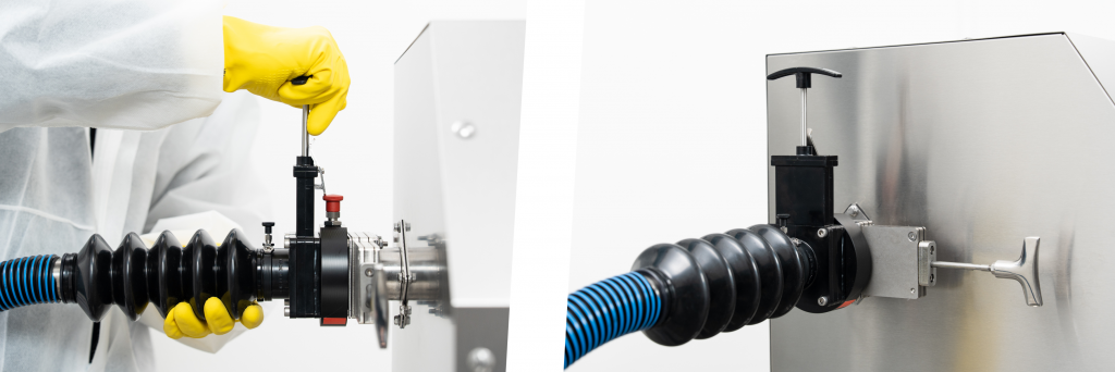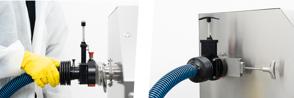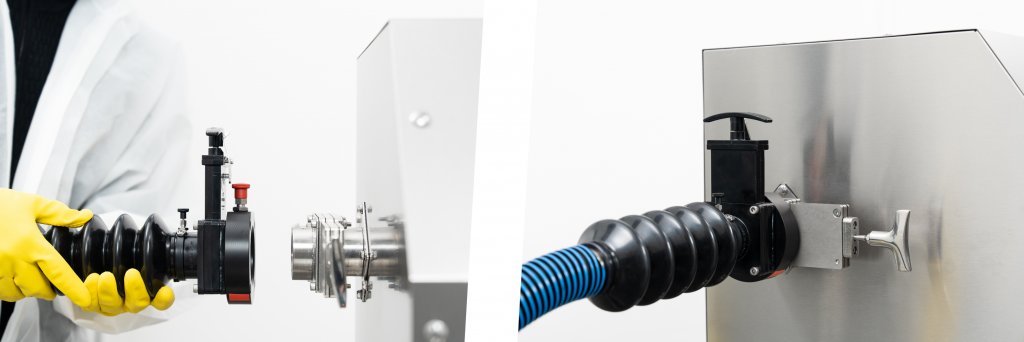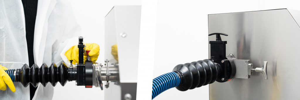 Das Ergebnis: ein durchgängig geschlossenes System, das höchste Sicherheits- und Containment-Anforderungen erfüllt. Sämtliche Kupplungen und Öffnungen bleiben während des gesamten Prozesses sicher verschlossen.